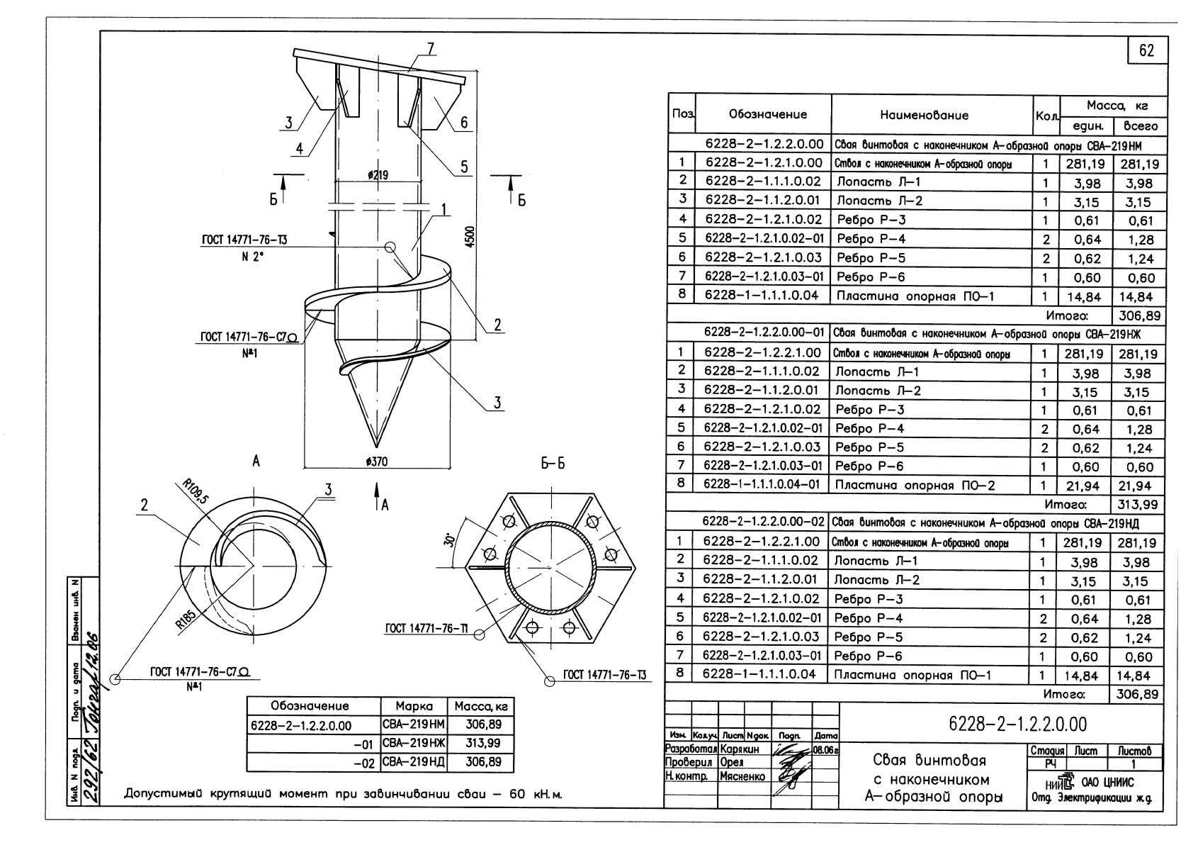 | № | Обозначение сваи | Наружный диаметр ствола, мм | Длина, мм | |||
